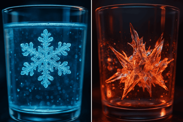 Представьте. Вода в колбах. В одной колбе — образец после звучания мягкой классической мелодии. В другой — после громкого рок-концерта. В лаборатории охлаждают жидкость, делают снимки кристаллов льда, а затем…