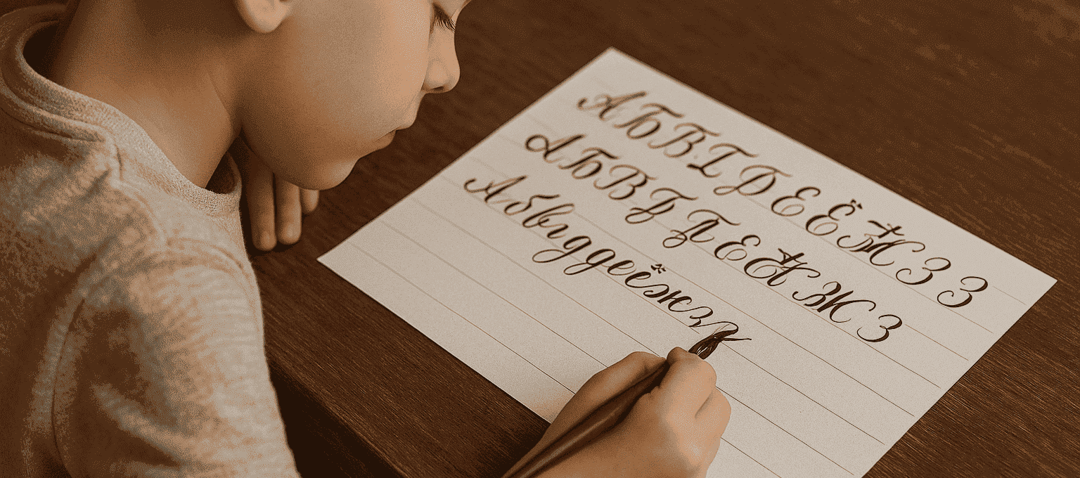 Начните с геометрии, а не с букв. Овалы, прямые, диагонали, «лесенки», ряды из одинаковых коротких штрихов. Цель — одинаковость. Пять минут овальных петель часто полезнее, чем полчаса букв, потому что тренируют стабильность формы. Затем переходите к связующим элементам: соединяйте овалы с петлями, ищите одинаковую высоту и постоянный наклон. Только после этого беритесь за алфавит — сначала строчные, потом заглавные.