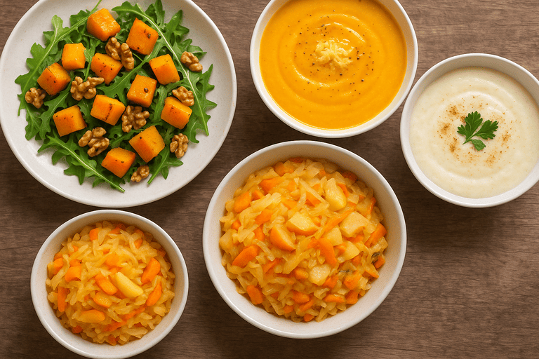 - Тёплые салаты: печёная тыква + руккола + орехи.