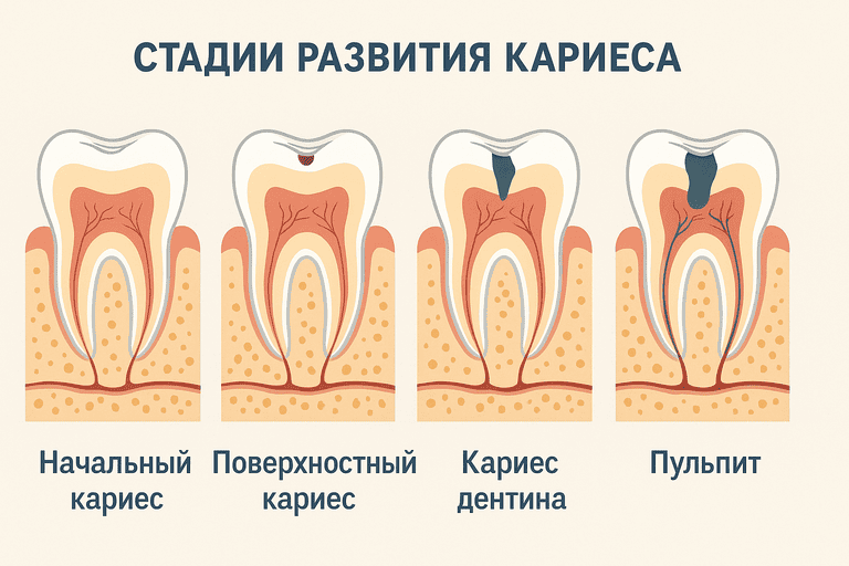 На самой ранней стадии видим белое или меловидное пятно. Поверхность гладкая, боли нет. Здесь процесс обратим. Достаточно реминерализации и дисциплины в уходе. Далее кариес становится поверхностным. Эмаль теряет структуру. Возникает шероховатость и начальная чувствительность на холодное или сладкое. Следом поражение переходит в дентин. Боль уже появляется чаще и дольше. Наконец, глубокий кариес граничит с пульпой. Риск пульпита растёт.