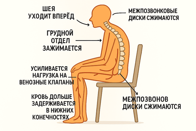Опорно-двигательный аппарат тоже подстраивается. Мышцы-стабилизаторы корпуса ослабевают, грудной отдел зажимается, шея уходит вперёд. Поясница берёт на себя то, что раньше делили пресс и ягодицы. Межпозвонковые диски при долгом статическом давлении получают меньше питания, дегидратируются, а связки утрачивают эластичность. Так появляется хроническая скованность, а затем — упорные боли.