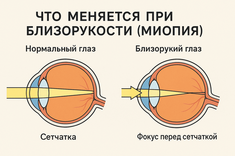 Близорукость называют миопией. Свет фокусируется не на сетчатке, а перед ней. Так возникает размытость вдали. Вблизи картинка остаётся ясной или почти ясной. Причина в избыточной оптической силе глаза или его удлинении. Иногда влияет форма роговицы и хрусталика. Минусовые линзы уводят фокус назад. Изображение падает точно на сетчатку. Чёткость возвращается.
