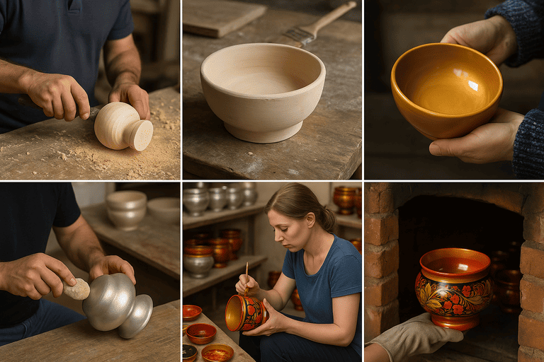 Золотистая линия на чёрном или красном поле — это не только декоративный приём. Это способ сказать о щедрости и свете простыми средствами: деревом, кистью, огнём. Когда глянец «зажигается» после обжига, предмет будто выходит из печи обновлённым. И кажется, что он несёт в себе ту самую волжскую тишину, пенье птиц и горячее дыхание огня, которое и превращает обычную деревяшку в вещь с характером и судьбой.