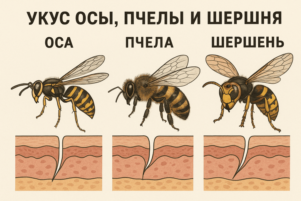 Кстати, многие говорят «укусы». Формально это не совсем точно. Пчёлы, осы и шершни «не кусают» кожу, они жалят. Укус — это действие мандибулами, которое у них применимо для охоты и работы со строительным материалом. Для нас важна именно инъекция яда, а не механический захват. Но в разговорной речи слово «укус» прижилось, и это не мешает пониманию.